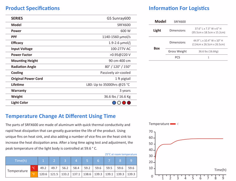 Sunray serie FX es un maravilloso LED de alta potencia dispositivo de luz que tiene el sistema de refrigeracióN pasiva inigualable.Realiza vigoroso y estable.La salida de luz oscilaba entre 570 umol/s a 780 umol/s, la eficacia es tan alta como 2.6 umol/j.Sunray FX es el accesorio máS versáTil y es adecuado para la iluminacióN de todos los tipos de cultivo.No importa que se aplica a la sala interior o invernadero ,que puede hacer el trabajo perfecto para usted.